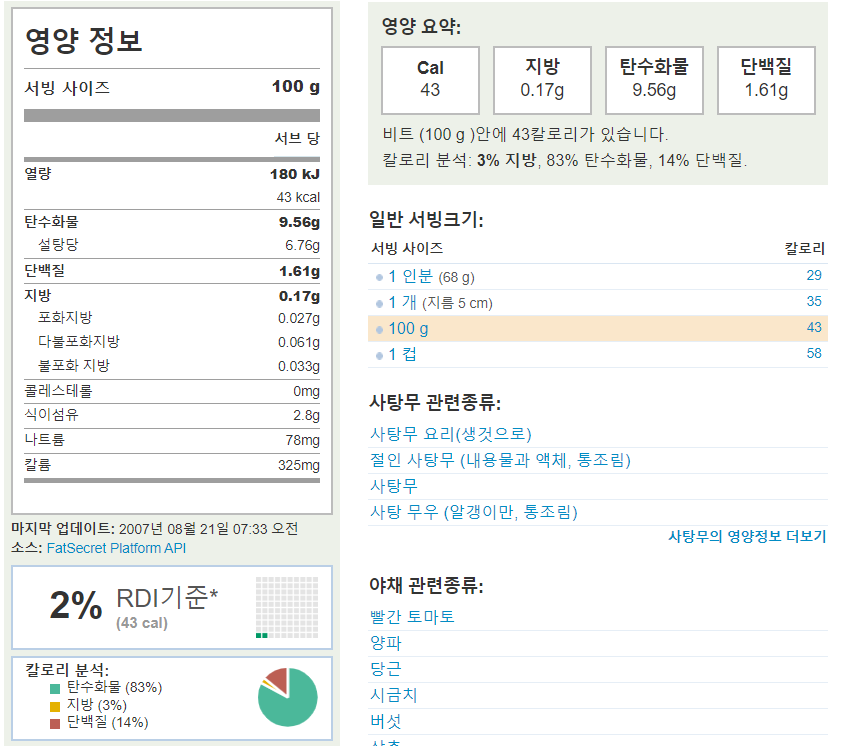 비트 100g당 칼로리는 43ckl이며, 당은 6.76g입니다.