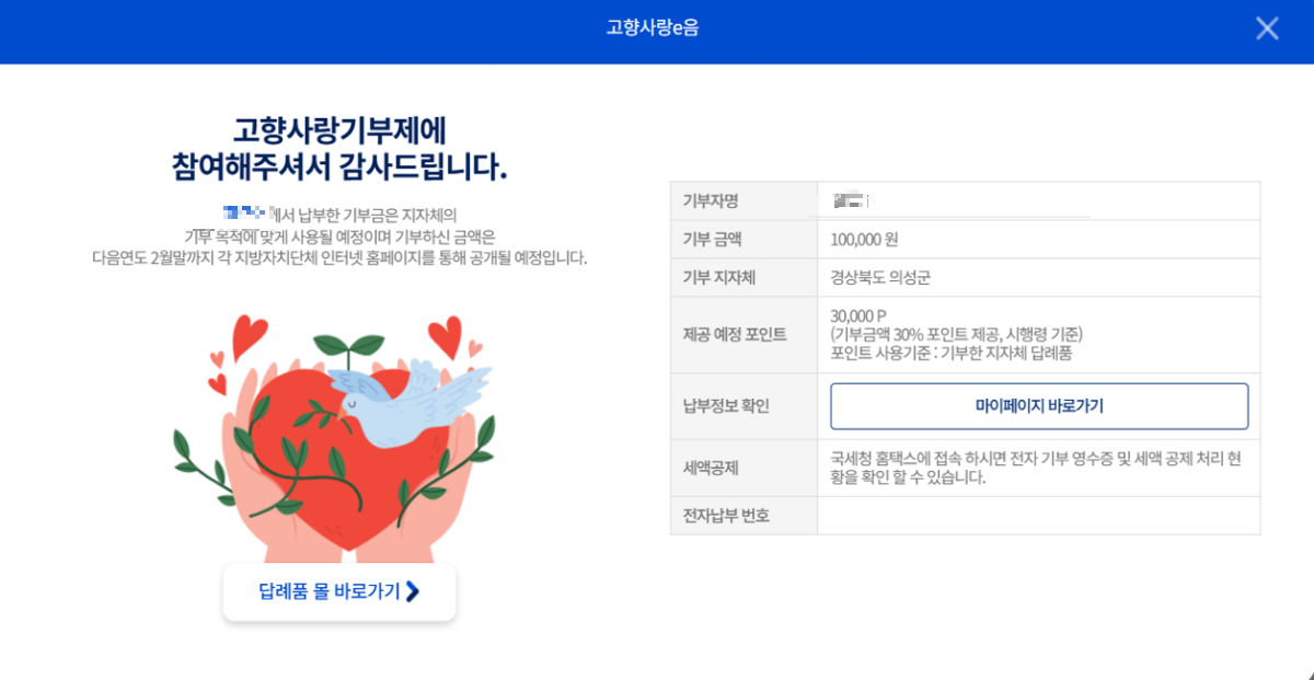 연말정산 때 기부를 하고 그대로 세액공제로 환급을 받았던 고향사랑기부제로 산불 피해 지역에 기부할 수 있다는 소식을 듣고 바로 기부를 했습니다.