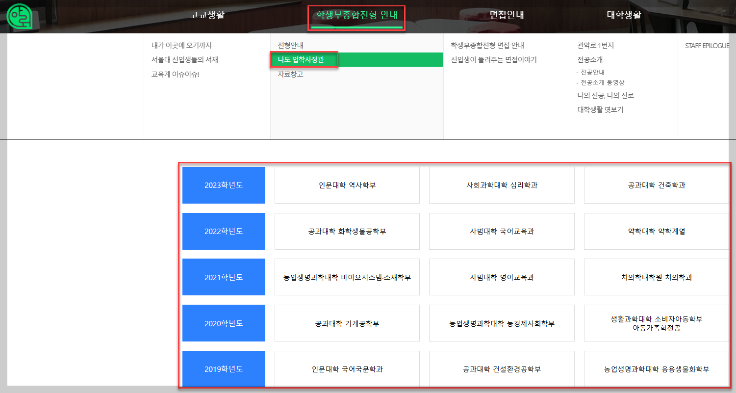 서울대 아로리 사이트에서 학생부종합전형 안내, 나도 입학사정관을 눌러보세요. 연도별로 3개의 학과에 각각 9명의 생기부와 자소서 일부를 공유해놓았습니다.
