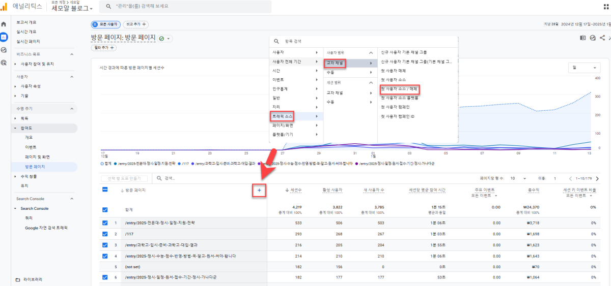 - + 버튼에서 트래픽소스> 교차 채널>첫 사용자 소스/매체 클릭