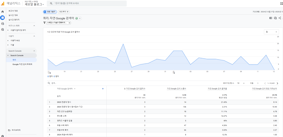 좌측 하단의 '서치콘솔' 아래 '쿼리'를 클릭해 보세요.