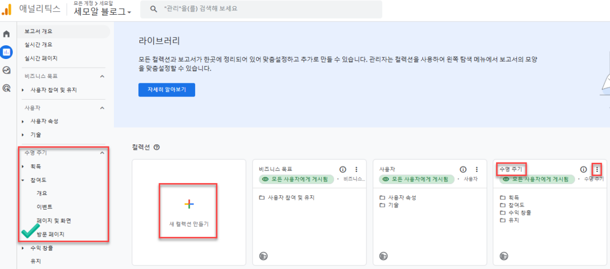 구글 애널리틱스에 들어가 '보고서'를 눌러보면 여러 데이터를 확인할 수 있어요. 좌측 하단의 '라이브러리'를 클릭해 보세요.